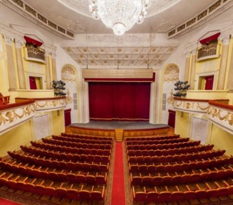 Внутреннее убранство театра сразу настраивает на торжественный лад. Просторный вестибюль с высокими потолками, массивные люстры, лепнина, изящная отделка в золоте и бордо создают ощущение классической театральной роскоши. Зрительный зал вмещает более 500 человек и отличается прекрасной акустикой. Атмосфера здесь — интеллигентная, чуть ностальгическая, с налётом аристократизма.